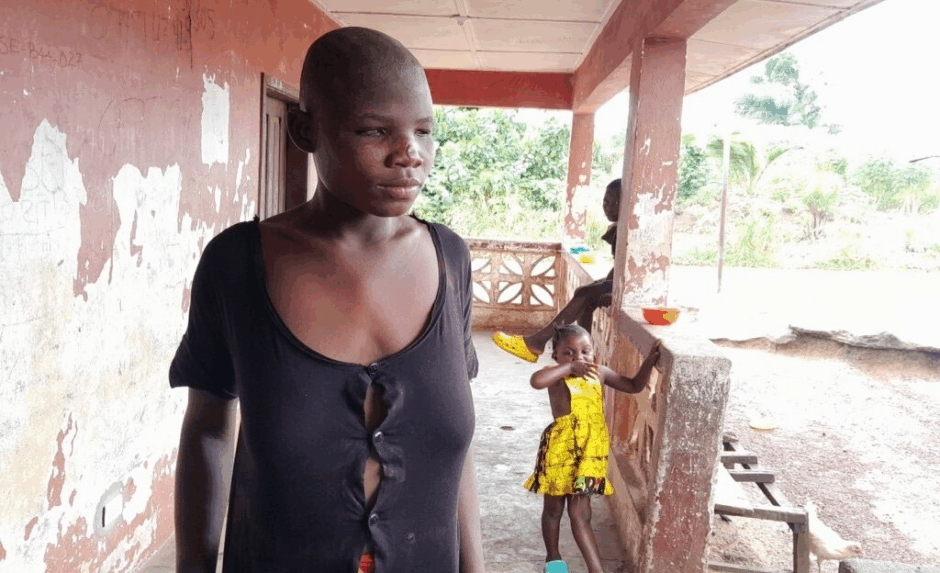 BUCHANAN, Grand Bassa County – Marpue Kpadoe sits on a small bamboo mat and moves her hands around in search of a bowl of water to wash her hands as she prepares to eat. The 18-year-old was born blind. She struggles to take her bowl of potato greens while her sighted peers file past her.