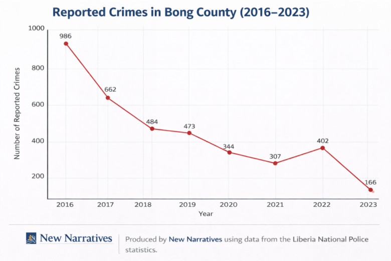 According to crime statistics compiled by the Liberia National Police, reported crimes nationwide fell from 13,280 cases in 2016 to 4,515 in 2023 —a decline of about two-thirds. In Bong County, the data show an eighty six percent reduction over the same period,