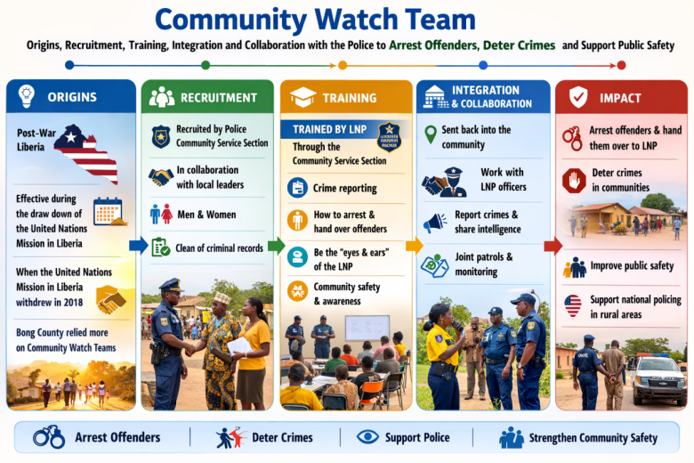 When the United Nations Mission in Liberia withdrew in 2018, Liberia’s security institutions assumed full responsibility for national policing. In Bong County, where officers patrol large rural areas with limited logistics, community watch teams expanded their activities.