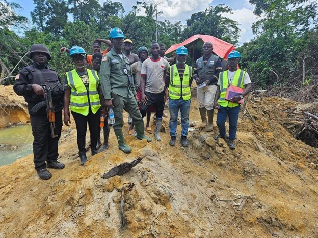 EPA staff stand with law enforcement officers, police, and rangers as they inspect illegal mining